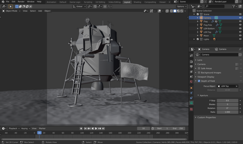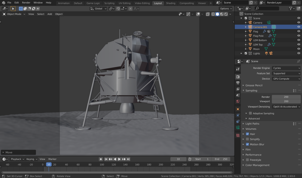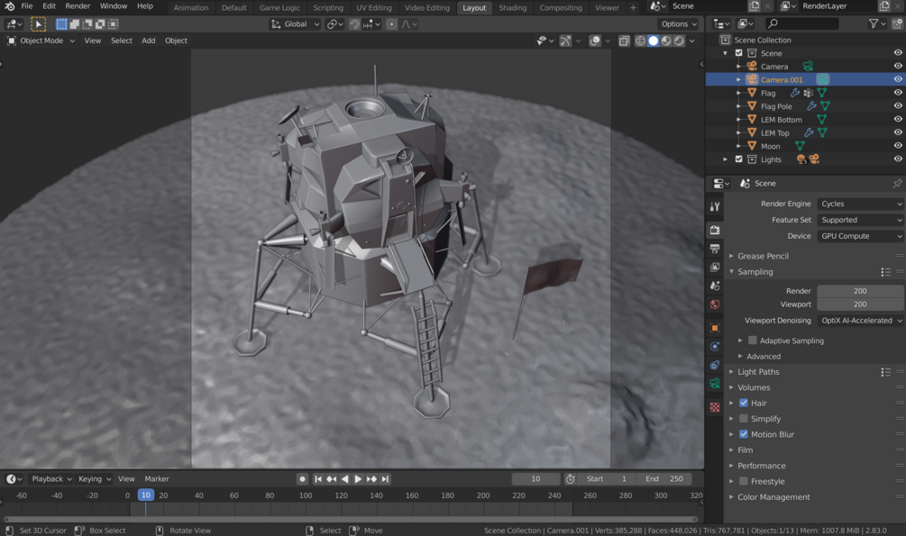 Comes with an American flag and is sitting on the moons surface. This file is Rendered in Cycles, but also looks great in the Eevee Render engine. The lights for the scene are on a separate collection, and can be easily turned on and off.