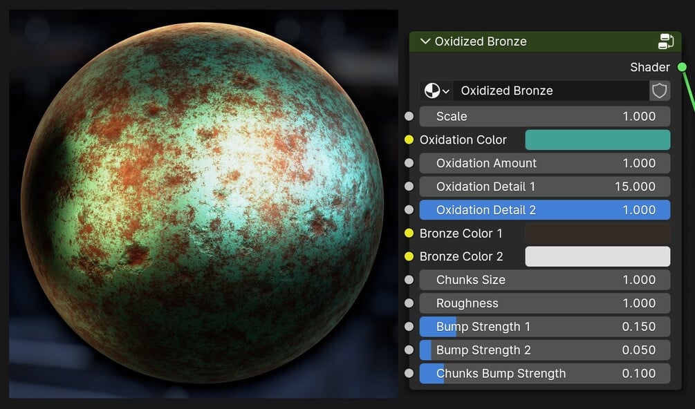 The material is joined into a custom node group, with many custom settings, like the scale, color, oxidation amount, oxidation detail, roughness, bump, and more!
