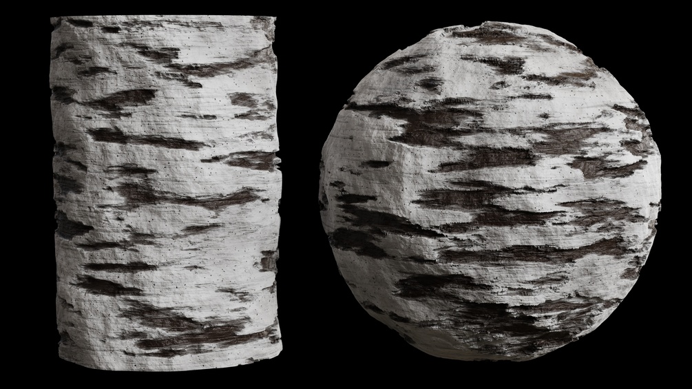Procedural White Birch Tree Bark Material, created with Blender's Procedural Nodes.
