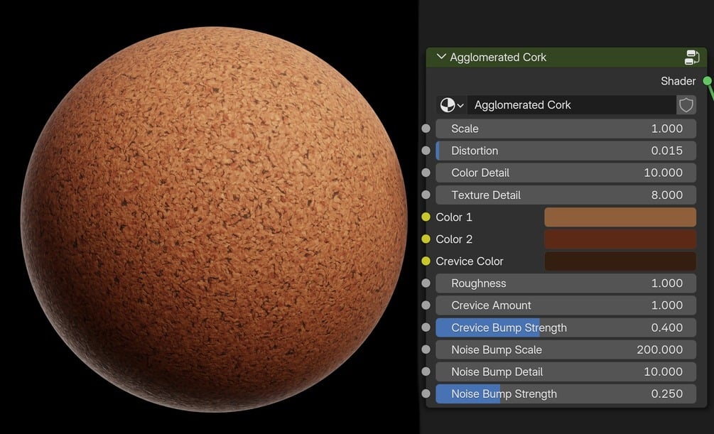 2 Procedural Cork Materials, created with Blender's Procedural Nodes.