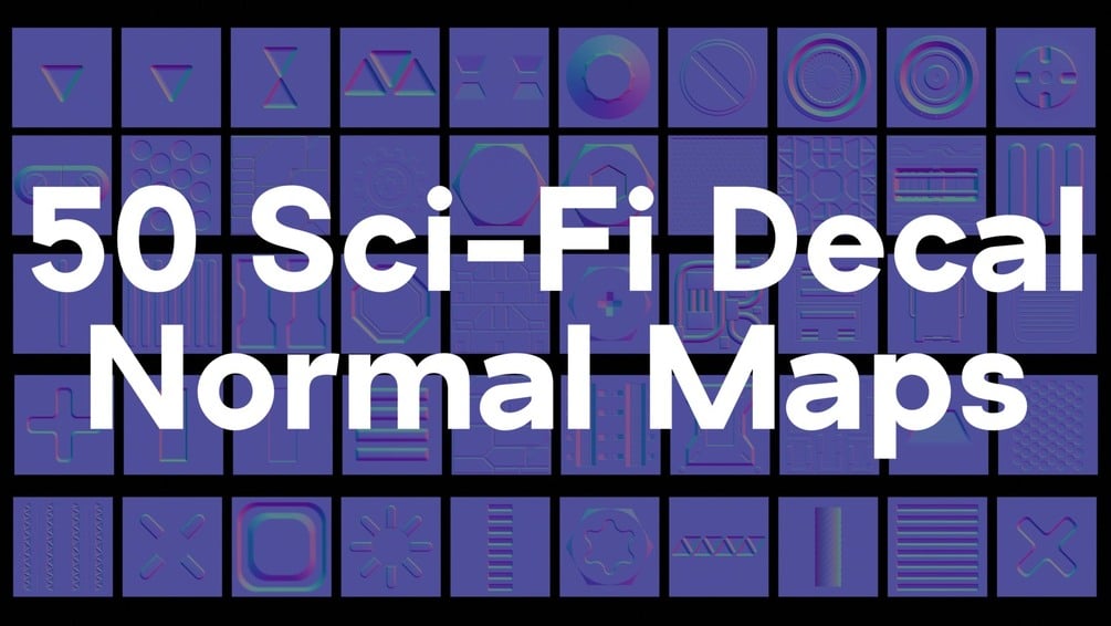Sci-Fi Decal Normal Maps Texture Pack, which comes with 50 Sci-Fi Decals. Use these normal map decals to add details to your 3d models.