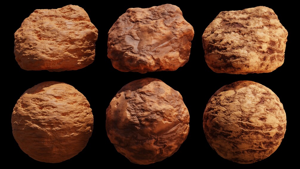 3 Procedural Desert Rock Materials, created with Blender's Procedural Nodes.