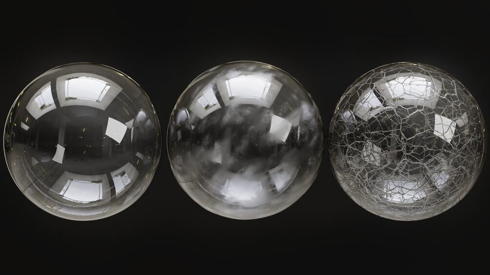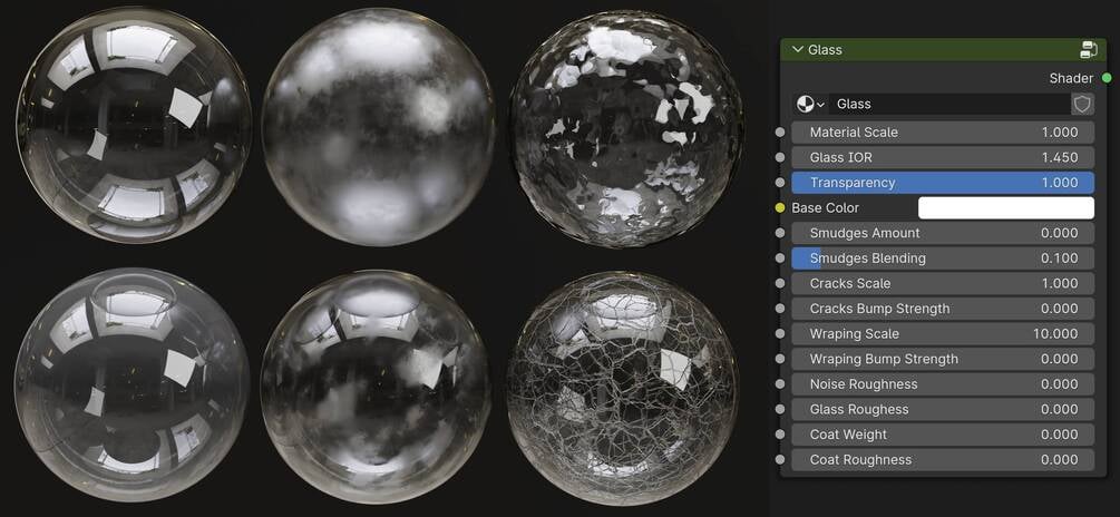 The material is joined into a custom node group, with many custom settings to change the look of the glass, like the texture scale, glass color, surface imperfections, roughness, cracks, bump strength, and more!