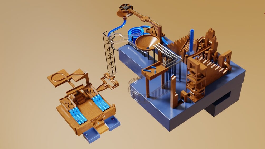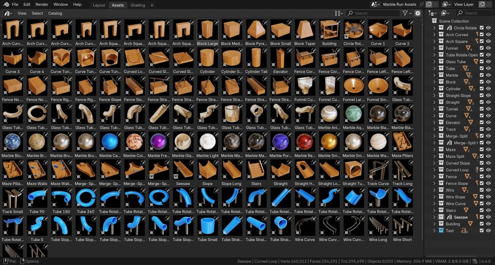 Marble run asset pack, which comes with 138 marble run 3d assets, pre-setup for Blender's asset browser.