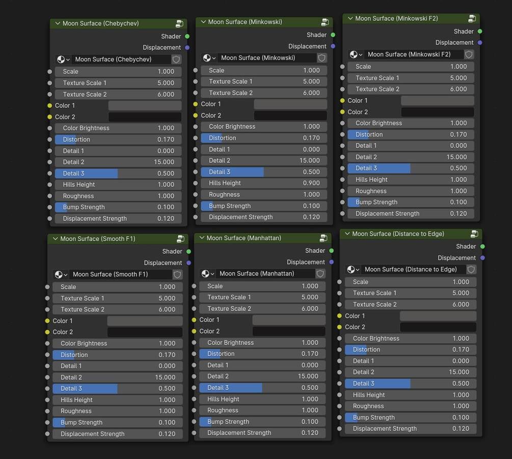 The material is joined into a custom node group, with many custom settings, like the scale, colors, hills height, color brightness, detail, roughness, bump strength, and more!