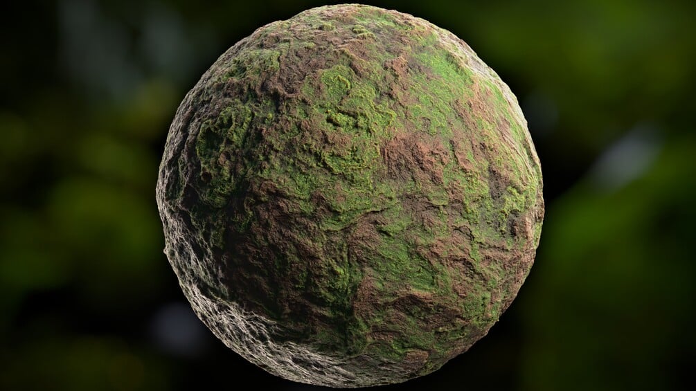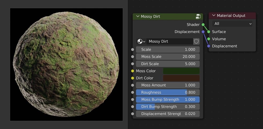 The material is joined into a custom node group, with many custom settings, like the scale, colors, moss amount, roughness, bump, and more!