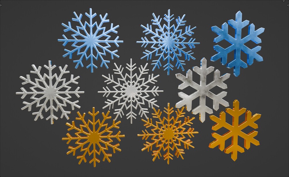 9 Snowflake 3d models, created with Blender. The snowflakes have some simple procedural materials on them. By purchasing, you are helping to support my channel. Thanks! ❄️ ❄️ ❄️