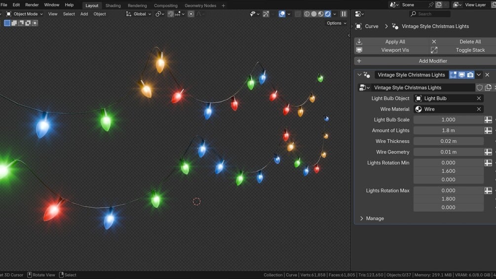 Geometry Nodes are applied to a curve object to create the lights. A light bulb object is instanced on the curve. The Geometry Nodes modifier has many custom values to control the lights, like the Light Bulb Object, Wire Material, Bulb Scale, Wire Thickness, Lights Rotation, and more!
