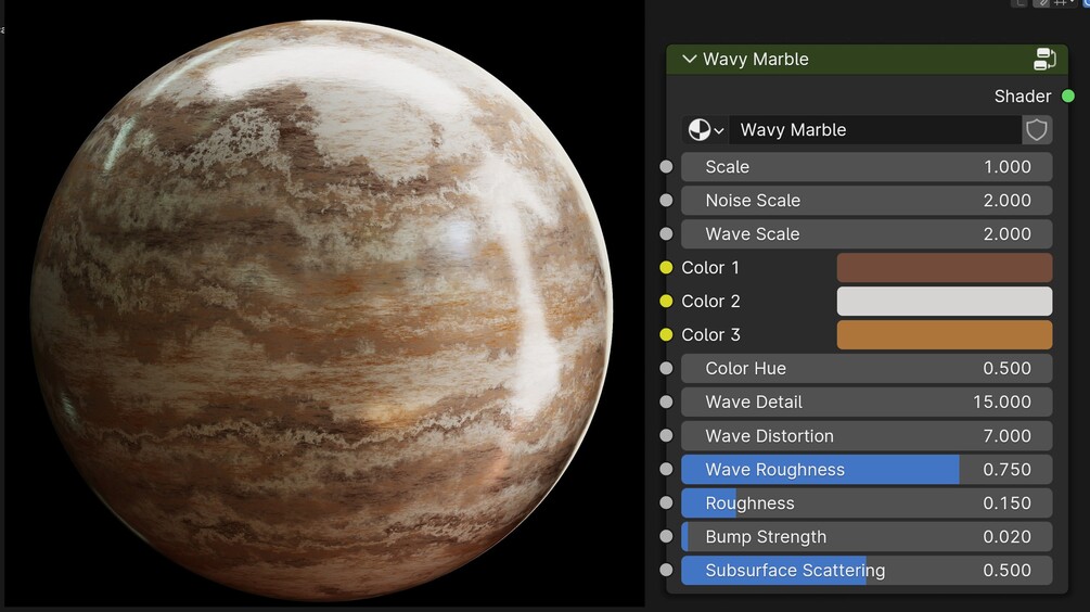 Procedural Wavy Marble Material, created with Blender's Procedural Nodes.