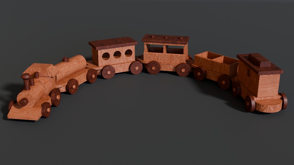 The objects are UV unwraped and have wood textures applied to them. The origin points of the train objects are located in the center of the connection points, so that you can rotate the train pieces and they look like they are staying connected. Each object is also parented to the object before it, so you can move and rotate the front of the train, and the rest of the train will follow along with it.